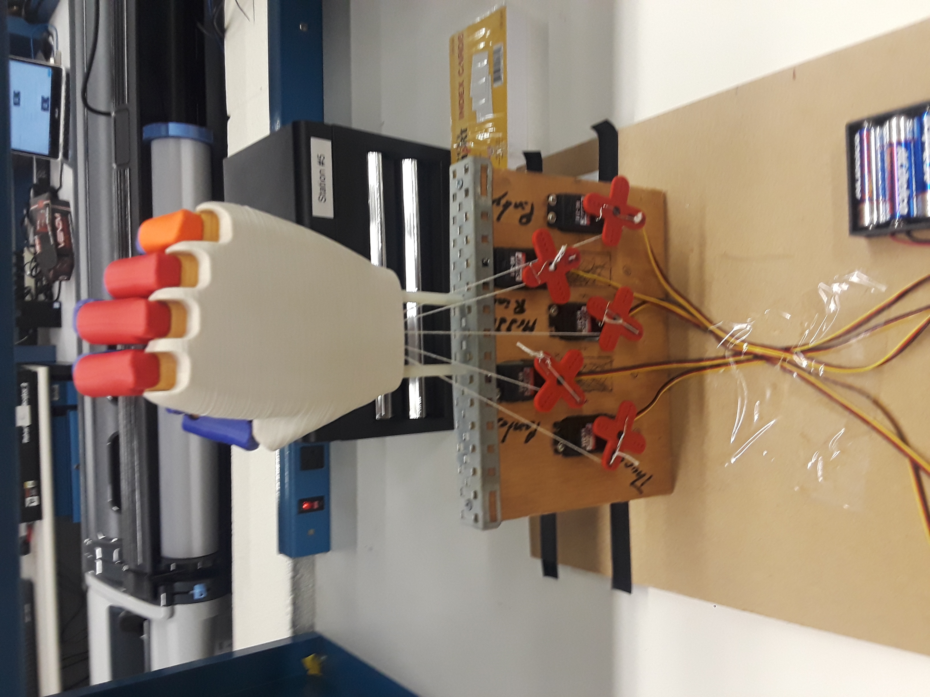 Servos were attached to strings that were fed into the hand and attached inside to the fingers.